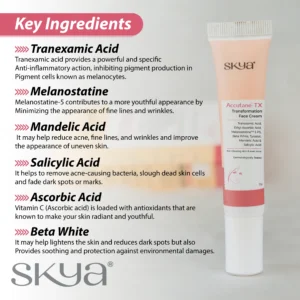 Reveal clearer, smoother, and more radiant skin with SKYA ACCUTANE-TX, a high-performance transformation face cream specially formulated to target acne-prone and sensitive skin. Packed with active ingredients that help reduce inflammation, unclog pores, and promote skin renewal, this cream is your go-to solution for visible skin improvement.